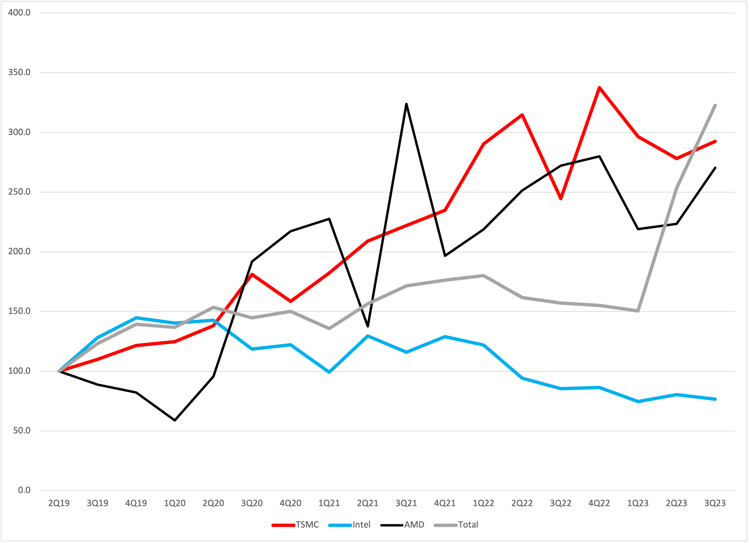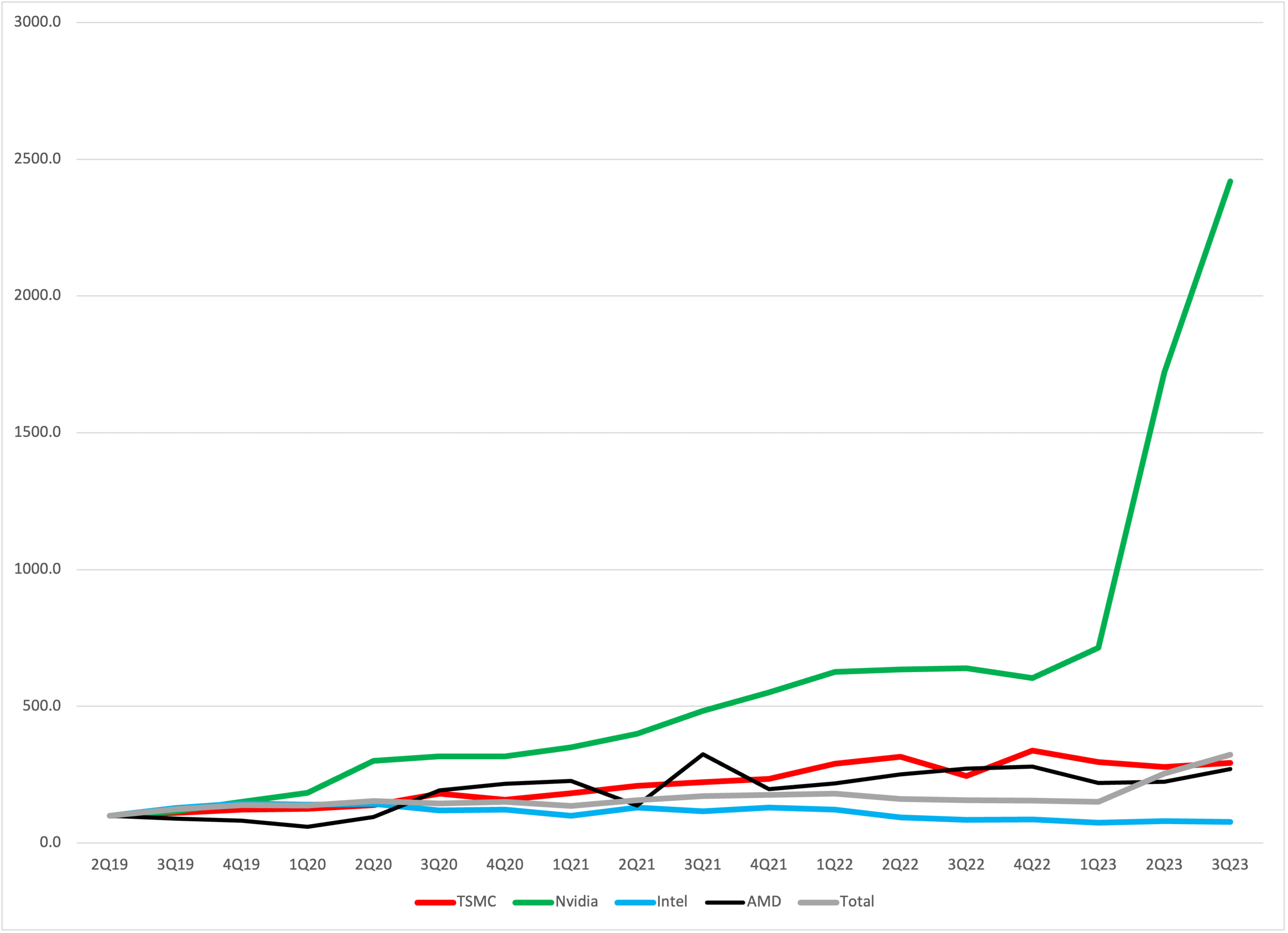 But Nvidia's growth is so strong that it drowns out the signal from all the others. So we plotted it again, without Nvidia. This time, we added TSMC to the mix as another proxy for the growth of the market.
