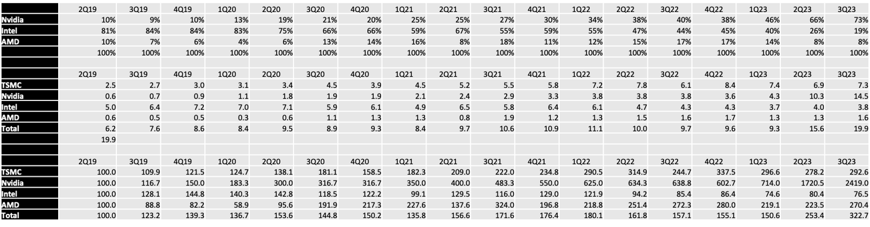 For TSMC we used their "HPC" segment reports, which they only began breaking out in 2Q19 which is where we start the series. Finally, it is worth keeping in mind that all of these segments include more than just CPUs and GPUs, as each company defines the segment a bit differently. This probably means that Intel's early revenue is inflated as it included networking, memory and a bunch of other products. So their decline is not quite as steep as it may appear. That all being said, the overall trend is still very clear.