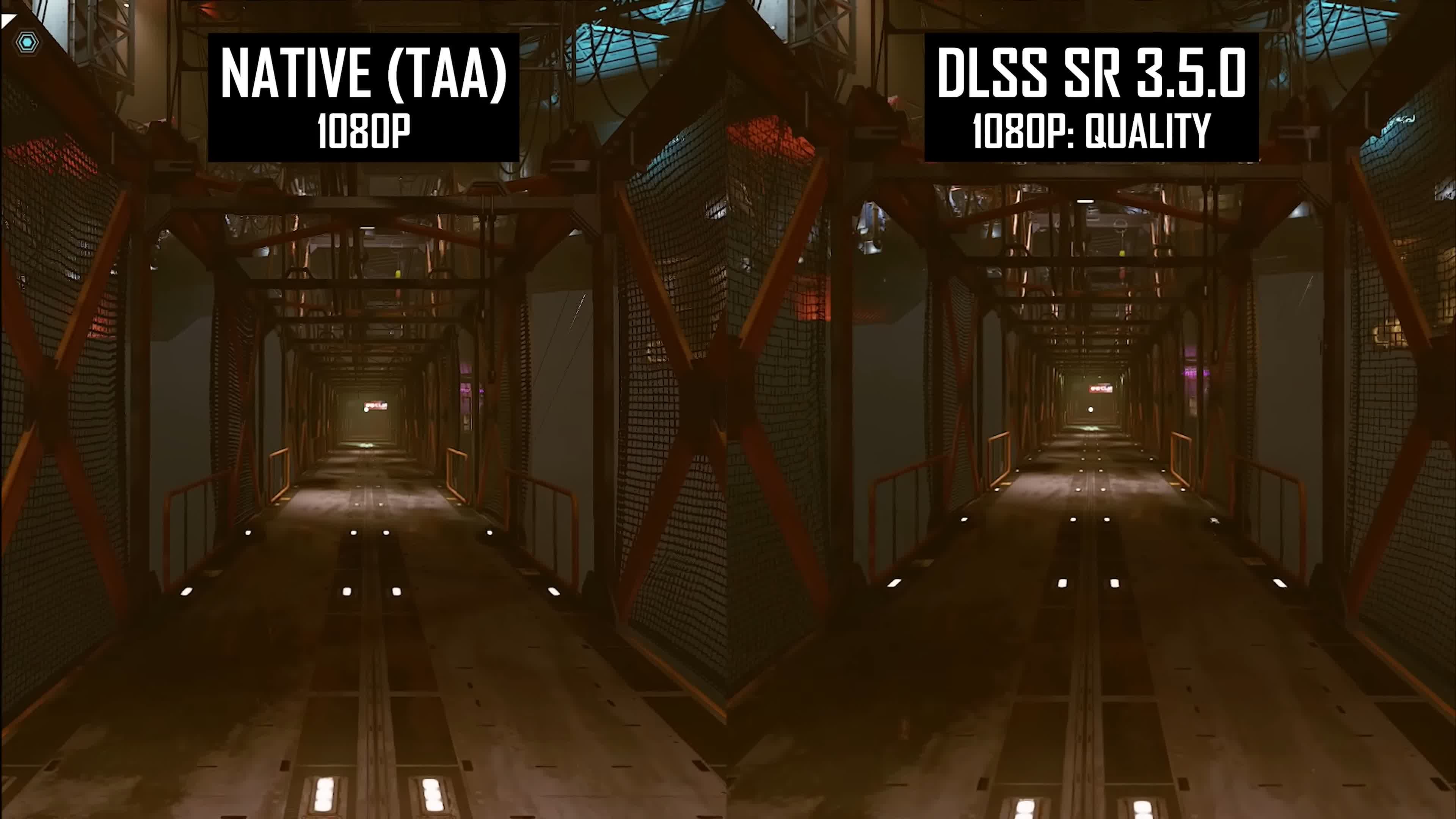 As we move through the opening which has lots of wire and mesh detail, the native presentation looks sharper and clearer with fewer artifacts particularly on those side meshes. I also noticed that reflections and shadows were higher detail at times, though this wasn't always the case and could be to do with level of detail configurations between native and DLSS. But the general level of detail and softness is similar in motion, it doesn't appear as though we're getting a Cyberpunk-like penalty when moving around and using DLSS upscaling.